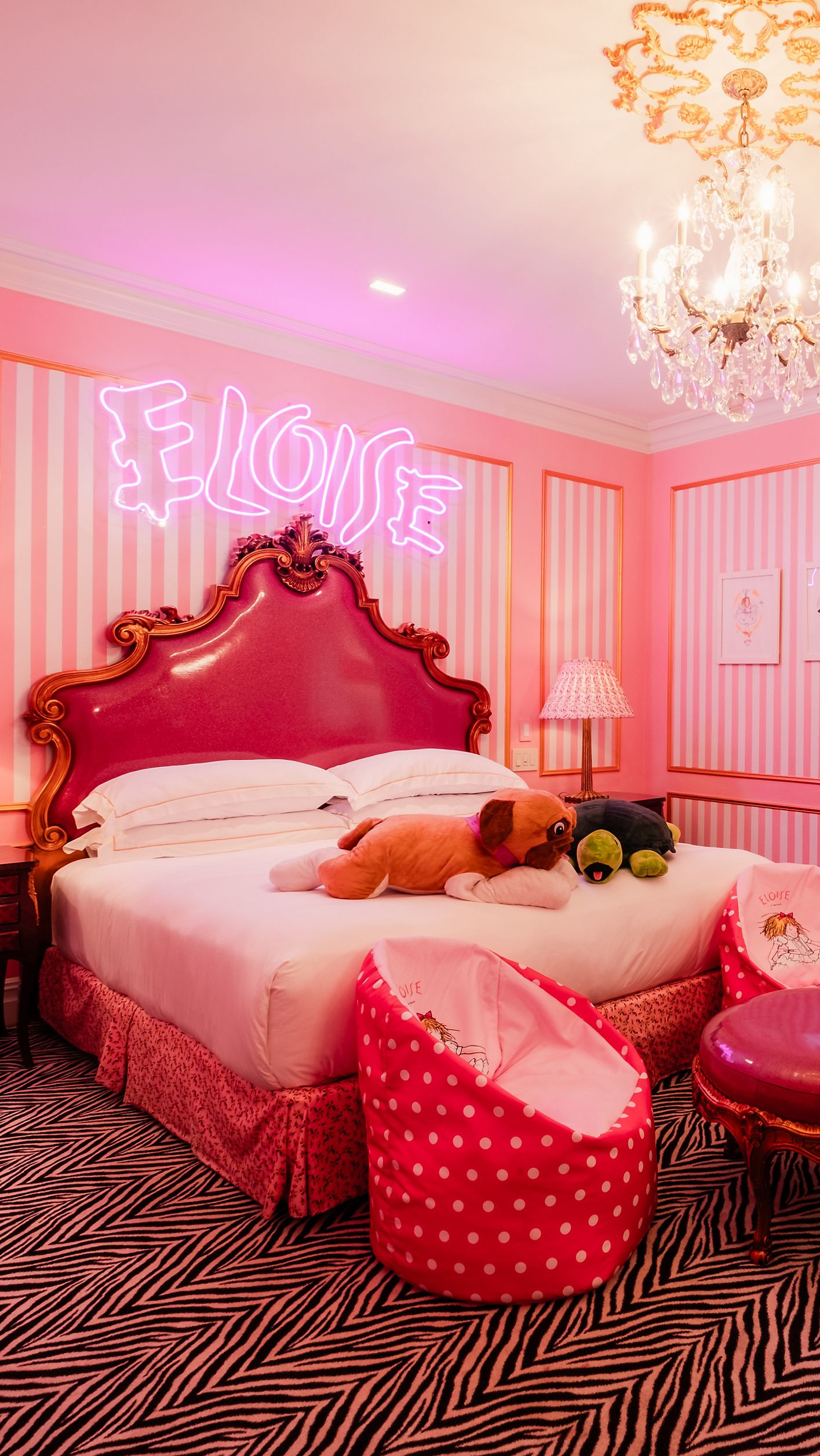 Pink and white Eloise themed suite with Eloise Bedding & towels, Tea Set, Eloise & Weenie dolls.