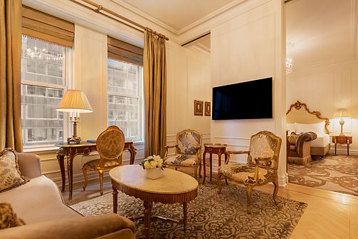2-bedroom suite overlooks 5th Ave. Large living room, dining area, 2 full bathrooms, claw foot bath tub, and separate shower. Includes butler service.